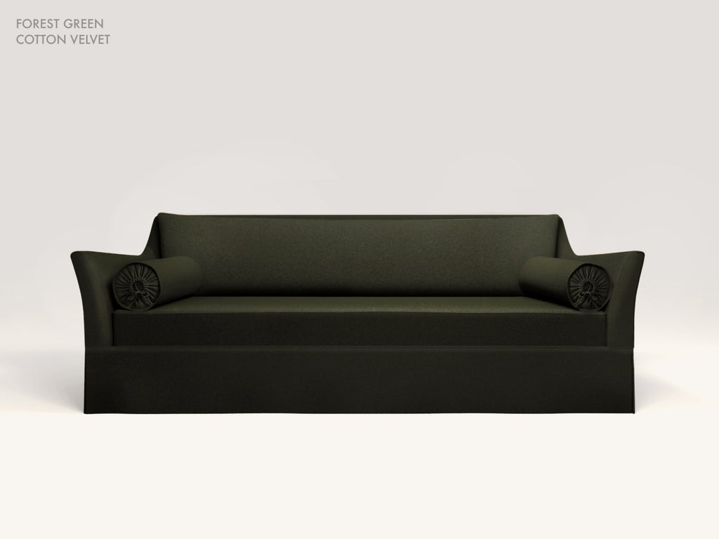 This fully upholstered sofa, features a smooth curve on the arm, a tailored skirt and single large down seat cushion with some extra depth. It's constructed traditionally using 8-way hand-tied springs, a solid wood frame and 100% down seat and back cushion.